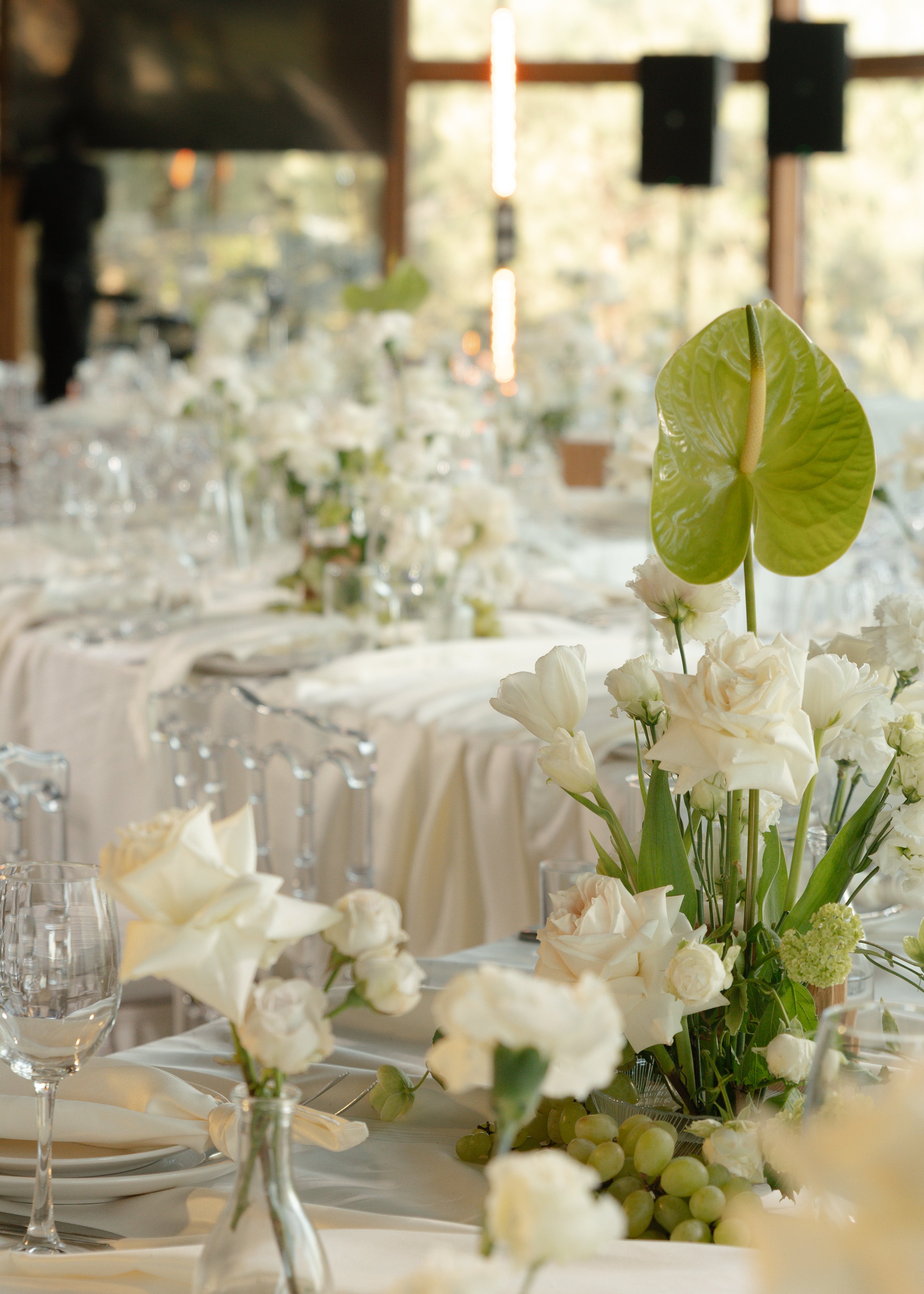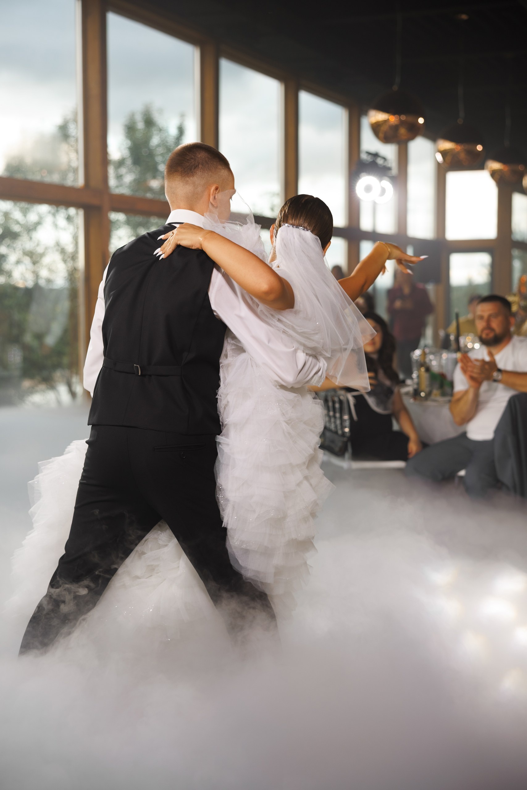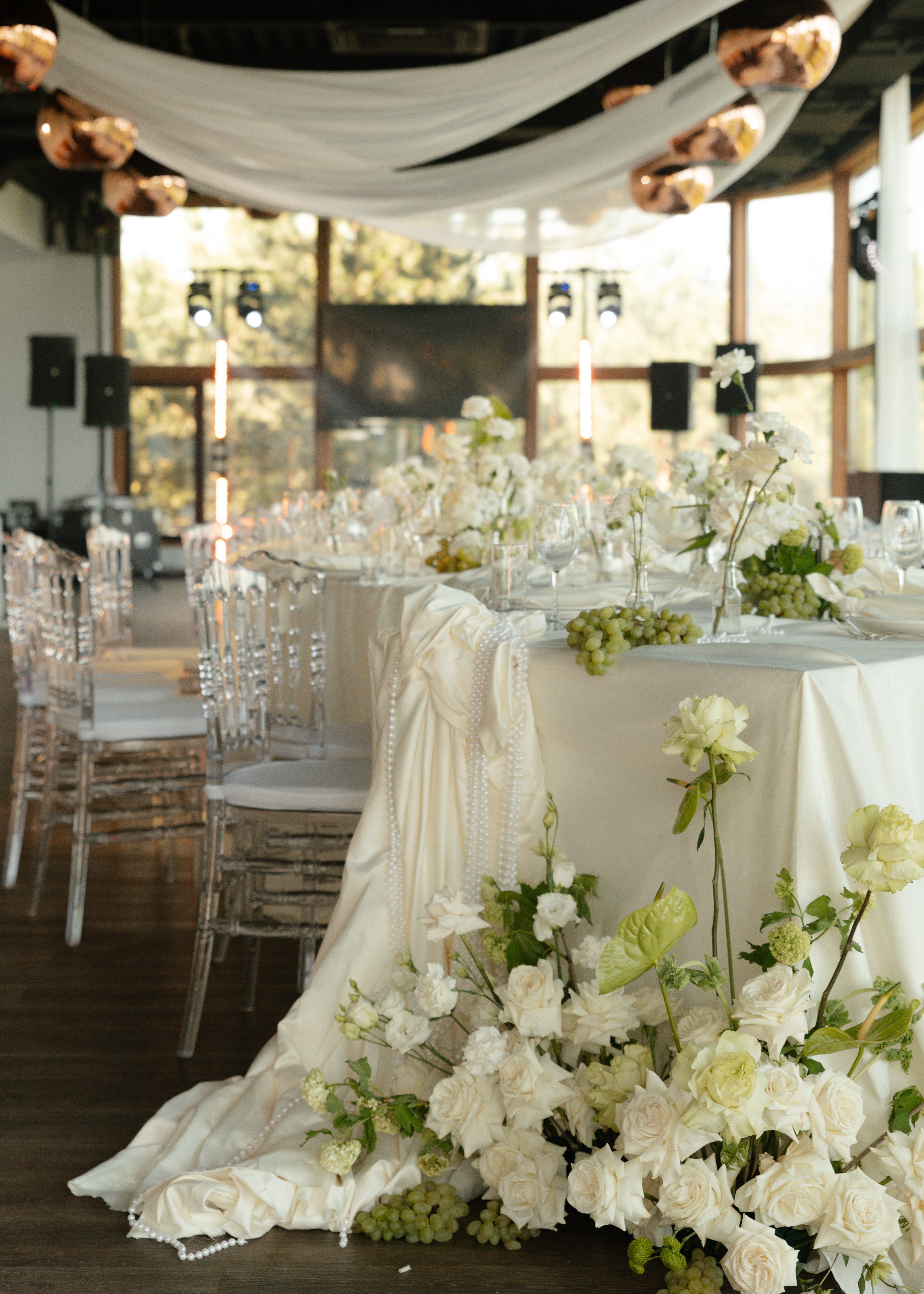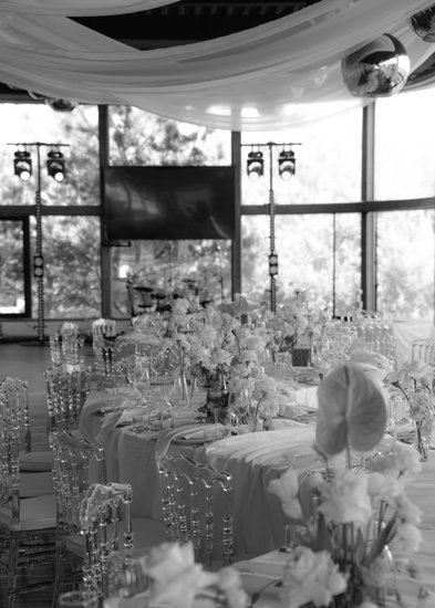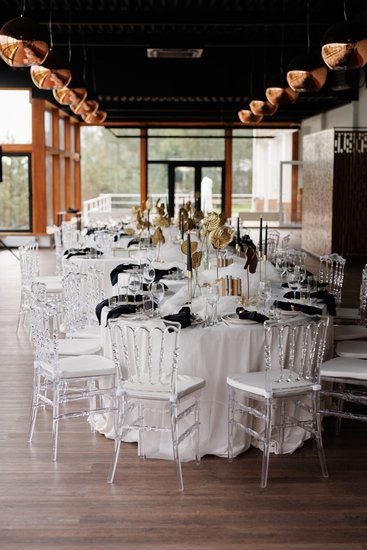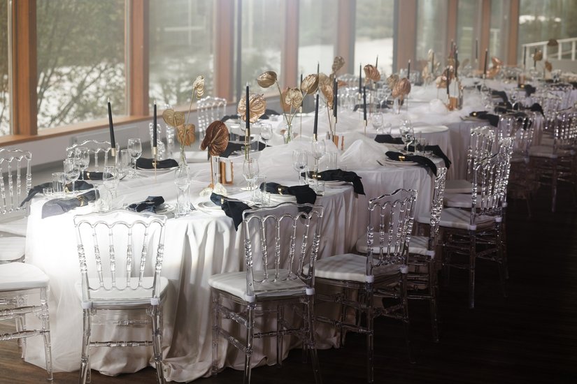 Панорамные окна практически по всему периметру зала создают воздушное пространство и ощущение слияния с природой. Зал можно декорировать на любой вкус, а можно и не декорировать вовсе, так как дополнением к минималистичному интерьеру является естественный природный пейзаж, прекрасный в любое время года..