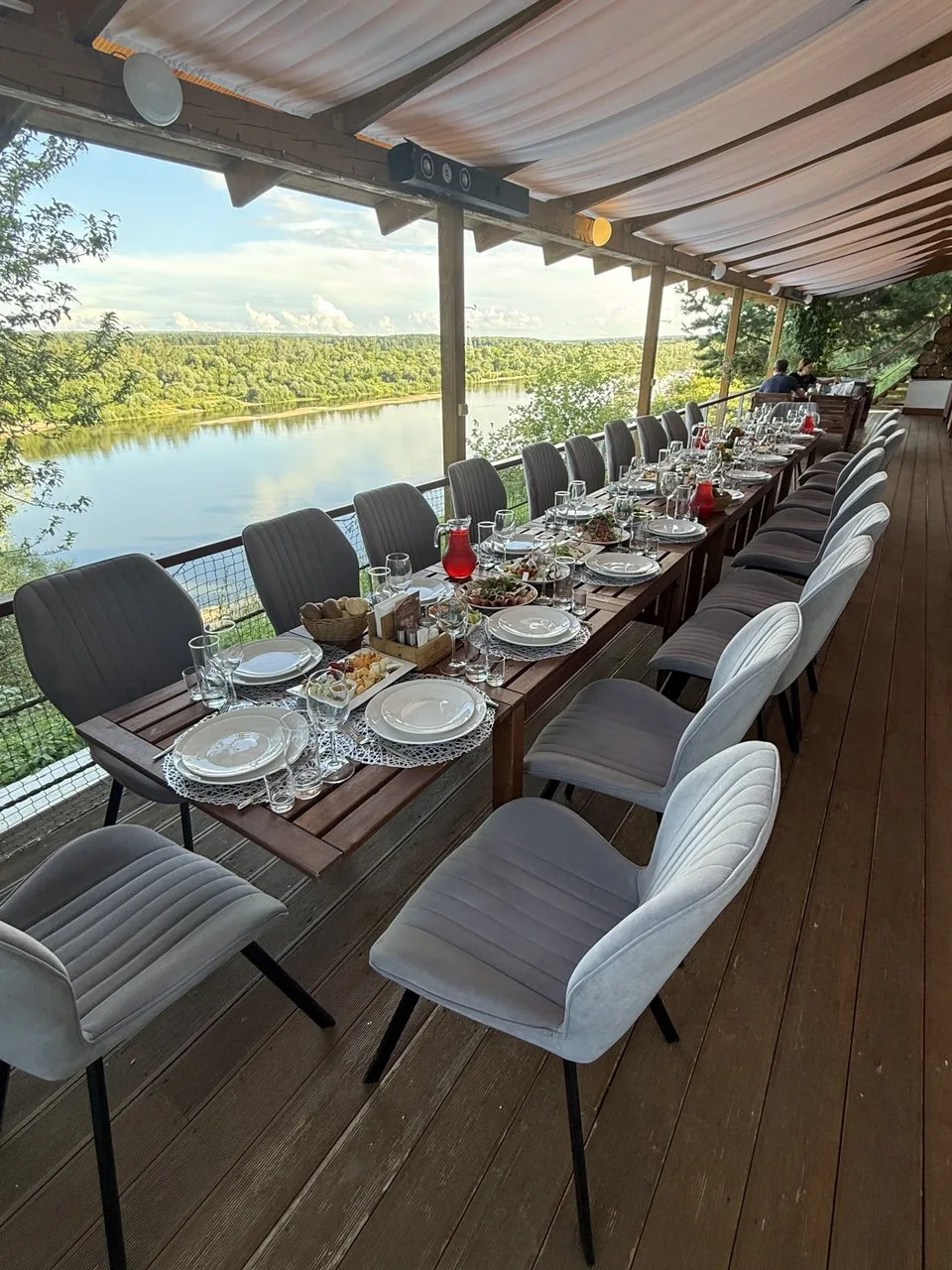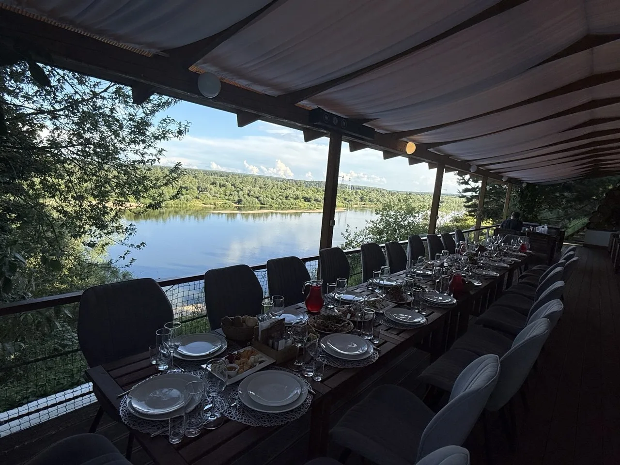 В теплое время года наши гости предпочитают столики на террасе с видом на Оку. В сезон навигации у нас много постоянных посетителей, которые заходят с воды. Наши гости отмечают большим плюсом возможность видеть свою лодку или катер, сидя за столиком на террасе кафе.